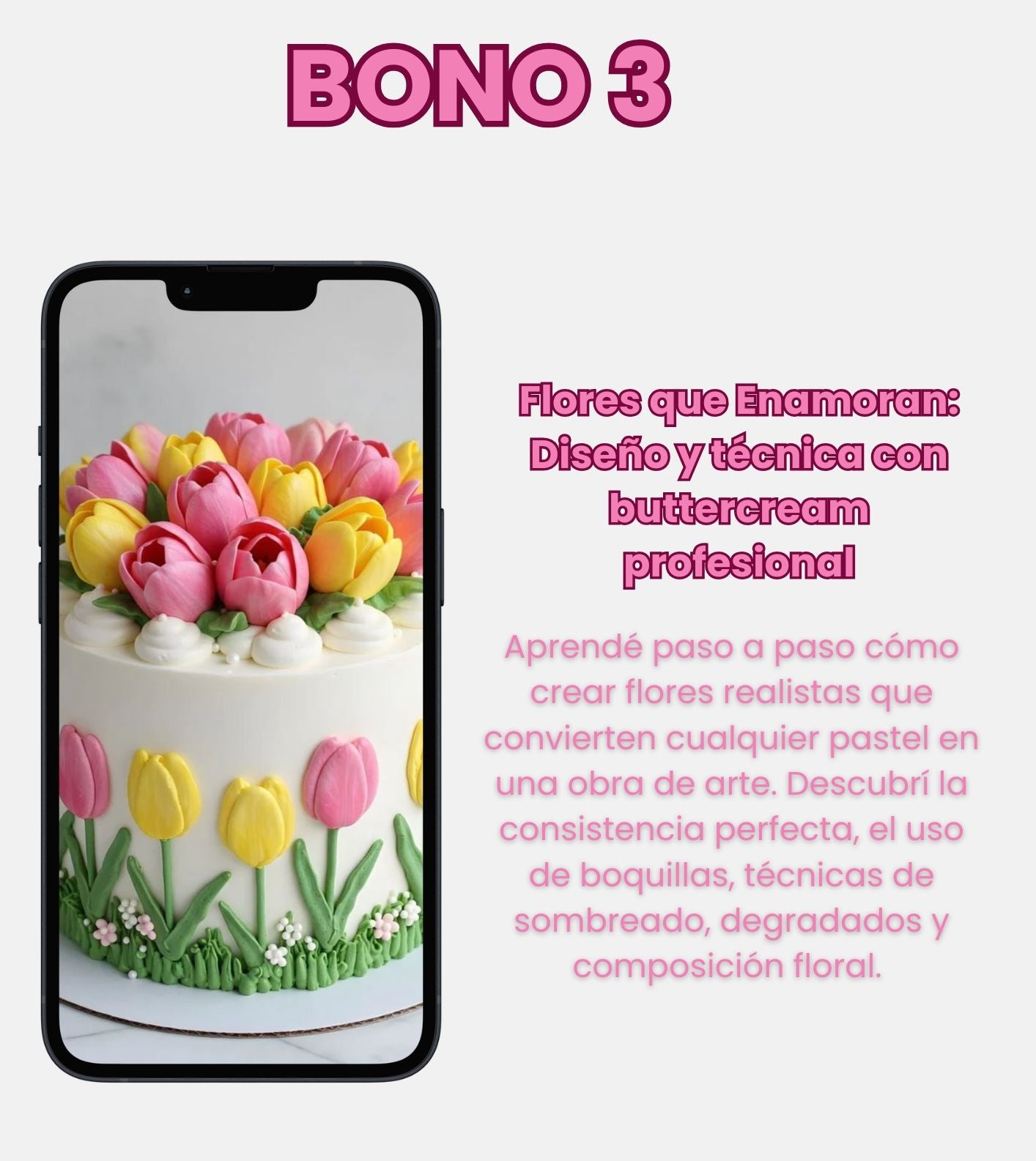 - 🌷 Flores que Enamoran (buttercream): Crea flores realistas: consistencia ideal, boquillas, sombreado, degradados y composición floral.