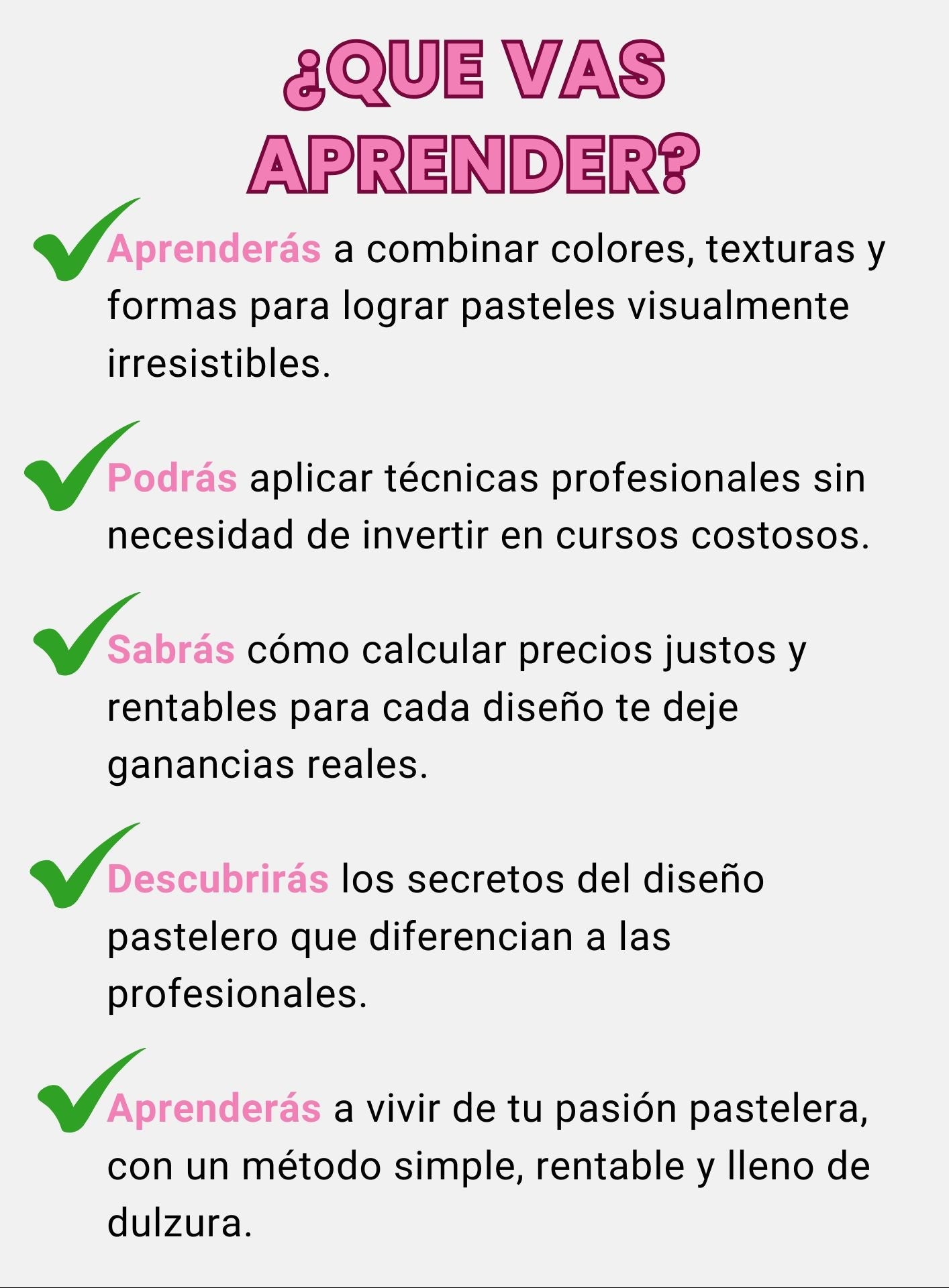 Lo que sí vas a lograr es romper el bloqueo creativo, crear tus primeros 5 diseños únicos y empezar a ver tus pasteles con otra mirada.